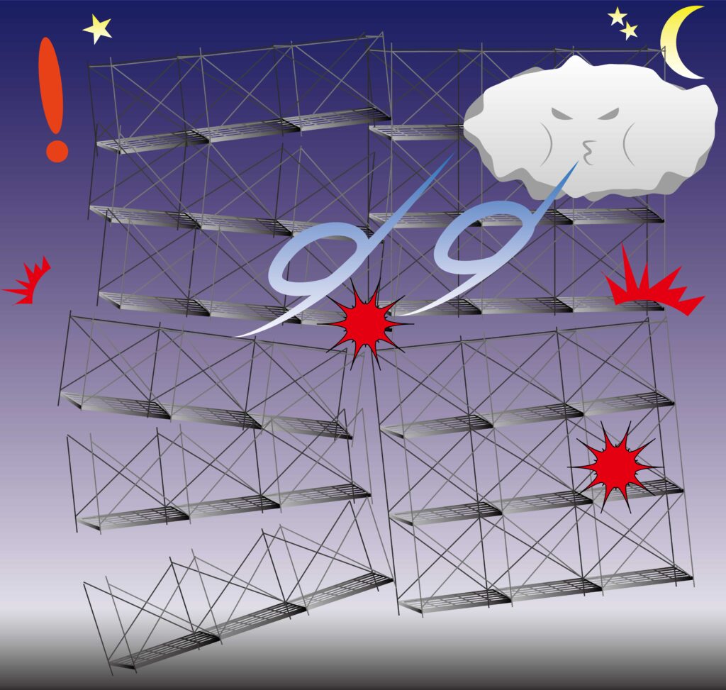 台風による強風は足場倒壊のリスクを高め、これにより重大な事故が発生する可能性があります。