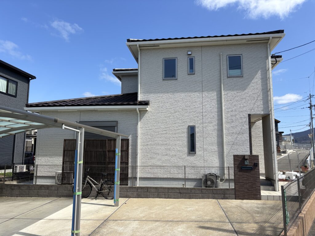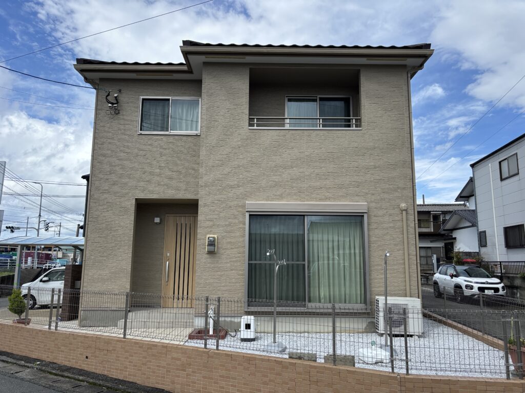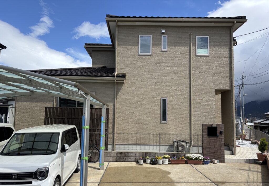施工前はホワイト系のお家でしたが、完工後は、ベージュ系の温かみのあるカラーに大変身!とても綺麗な仕上がりです。外壁のカラーに合わせて、エアコンダクトや雨樋なども同系色のカラーで統一感を持たせています!